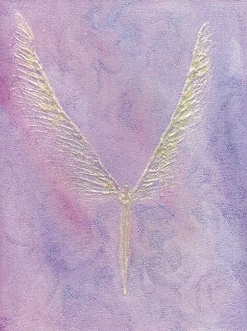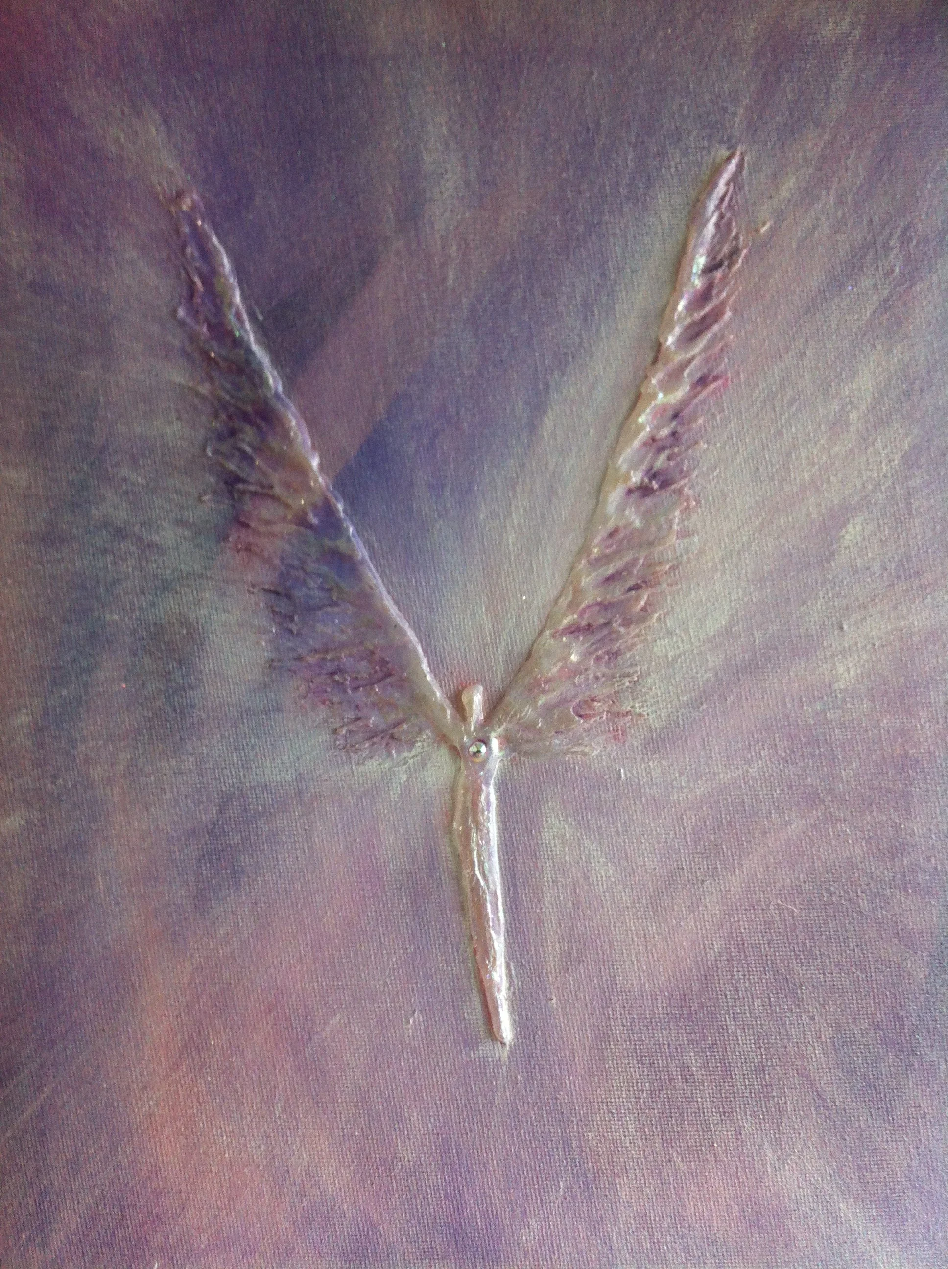 This is an early acrylic painting, probably about 8" x 10". The figure has refined, and the wings are becoming more defined. I tend to use a lot of this pale pink violet colour as the angels seem comfortable in its energy. I don’t recall where this one went to, I am sure it is happy though!