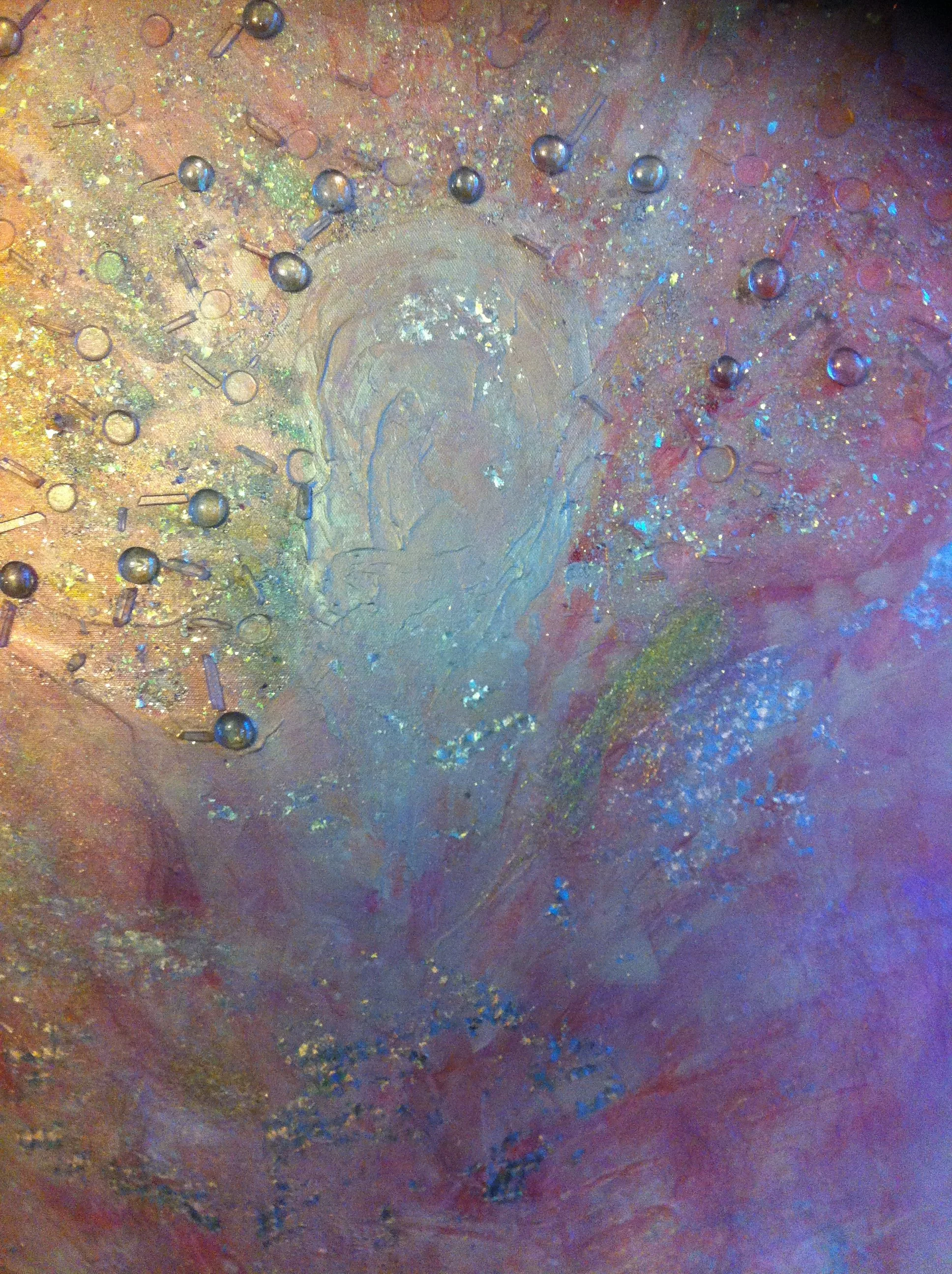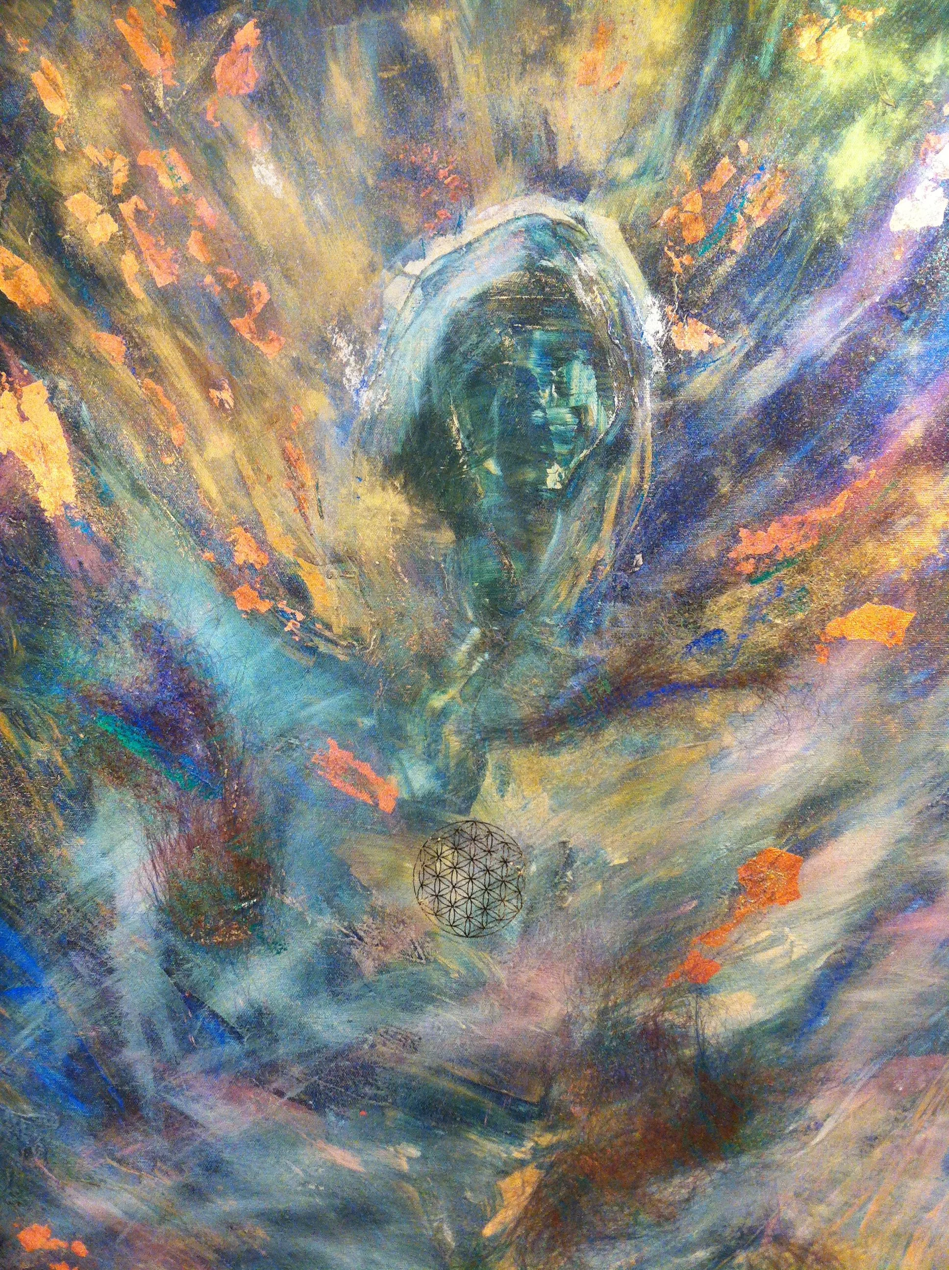 Due to the physical size and incredibly complex, multidimensional nature of the original artworks, I have been guided to offer what amounts to a “portrait” of each on the ARCHAEoNS. I have captured the image of the top portion of the painting, which can be most readily interpreted as the head or face. This actually gives yet another experience, as one engages with a very different aspect of the whole.