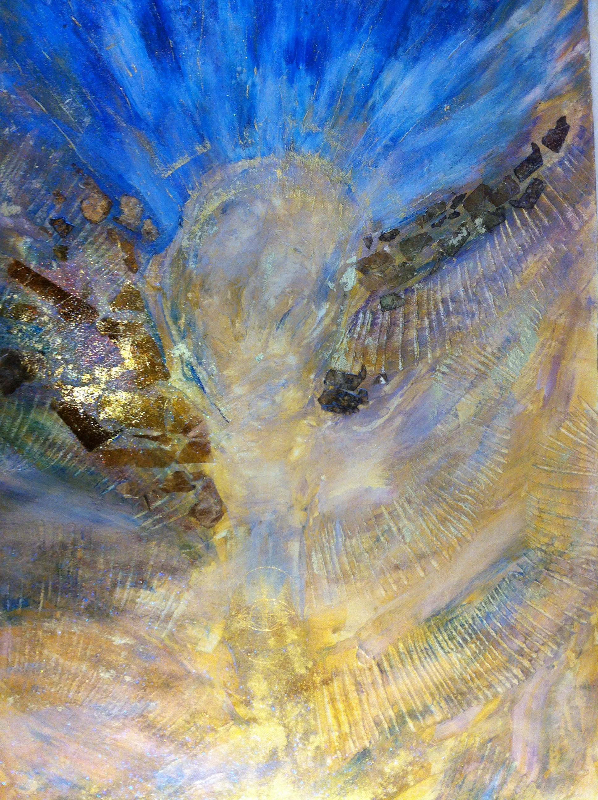 “The ARCHAEoNS are the ascended energies of the Archangels and have been anchored in the Earth Plane since 22nd December 2007. They are now a perfectly integrated Collective Consciousness of 6 beings, individually balancing the aspects of masculine/feminine energies and challenging us to recognise and uphold our own Truth as they themselves have undertaken to do. They are the Acting Principles of The Godhead. Each ARCHAEoN is represented as a painting on canvas, 6ft x 2ft, incorporating crystals, essences, sound, metals and the very distinctive personal vibrational imprint of these mighty Beings.”